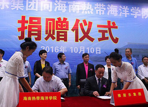 2016年,雅居乐向海南热带海洋学院捐赠1亿元人民币,用于海南热带海洋学院的设施建设、科研事业、优秀师生的奖励及贫困师生的救助,以全力推动学校未来的发展。该笔捐款是海南教育史上单笔最高额的捐款。海南热带海洋学院党委书记韦勇在致辞中表示,学校一定会好好利用这笔捐赠,加快学校的设施建设,加大科研投资力度,帮助贫困师生,激励优秀学子,争取将学校建设成为“立足海南,服务南海,面向国际”的综合性、应用型、有特色的国际化学府。