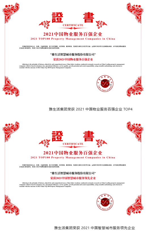 雅生活蝉联中国物业服务百强企业TOP4,持续巩固行业龙头地位