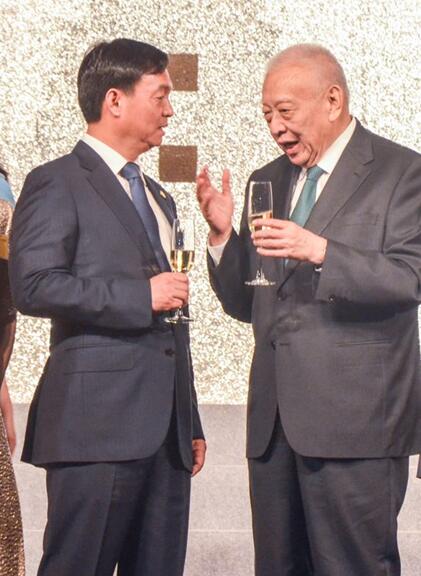全国政协副主席董建华(右)与雅居乐集团主席陈卓林交流